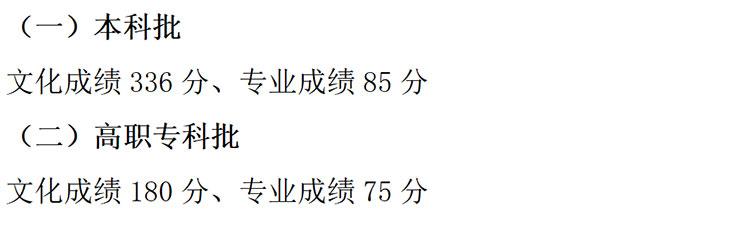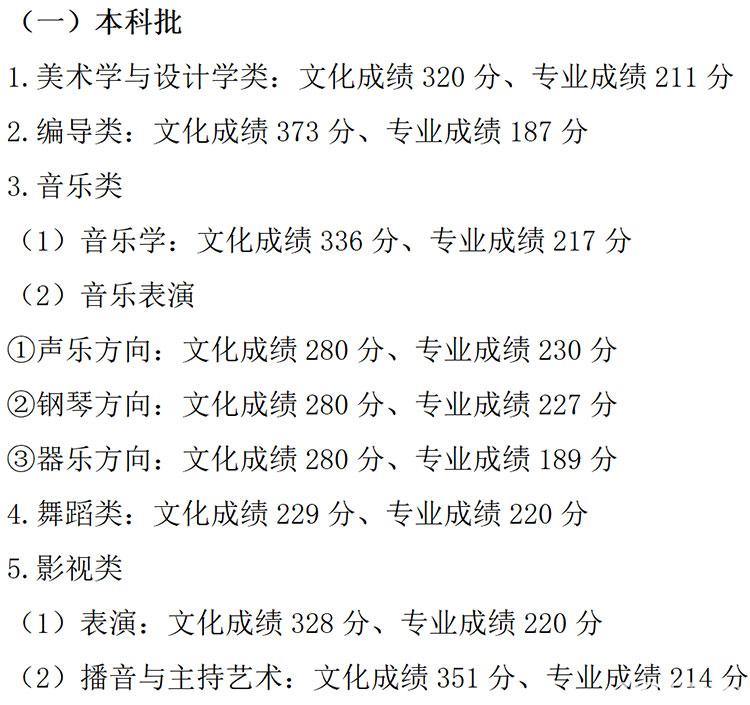 省统考:美术专业208.00分;音乐专业78.00分;舞蹈专业66.00分;表演专业72.00分;书法学专业75.00分。省联考:播音与主持专业80.00分;广播电视编导及戏剧影视文学专业306.00分;航空服务艺术与管理专业251.00分。