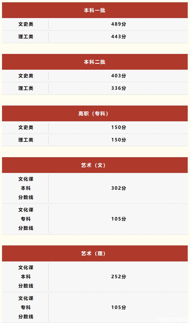 本科第一批:520分;本科第二批:433分;专科批:150分。