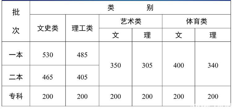 四、体育类专业的录取由文化分数线和体育统考分数线双线控制。各批次的录取最低控制分数线分别为: