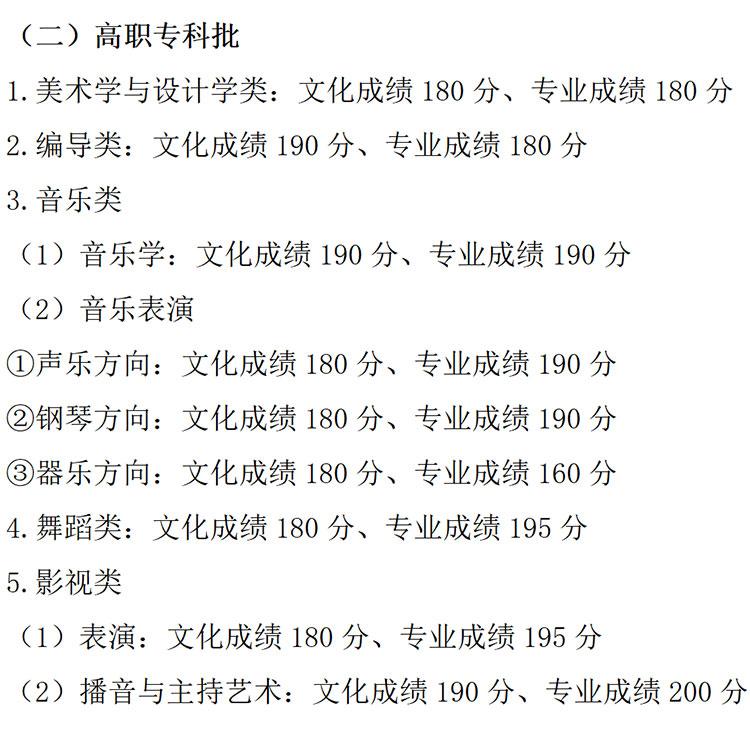 (五)音乐表演类专业:本科245分;专科200分。其中乐队指挥与合唱指挥招考方向无单科成绩要求;音乐表演类其他招考方向视唱练耳及乐理单科成绩本科层次不低于40.00分,专科层次不低于30.00分。