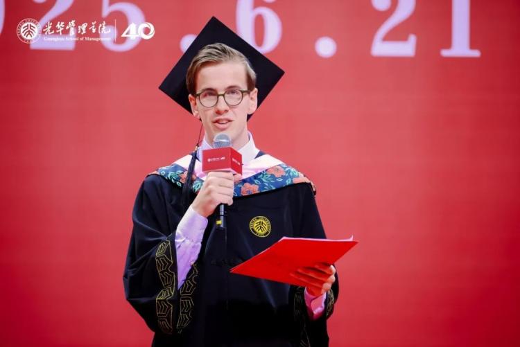 饮水思源。“未来领导者”国际本科毕业生代表高大安(Daan de Groot)回顾了自己在光华的求学历程及难忘记忆,并用“饮水思源”来感恩万里求学的初心——对世界的好奇、对中国的向往,以及光华所赋予的精神源泉与崭新起点。他表示,光华不仅传授了经济学、管理学等专业知识,更教会了自己如何保持开放的心态、倾听多元声音以及在文化差异中学习的能力。在一个容易筑墙隔绝的世界里,光华教会了自己如何架桥相连。他寄语同窗,无论未来走向何方,都应铭记在光华这一新“源头”所传递的理念:保持好奇心,接受不确定性,勇于接触新事物。