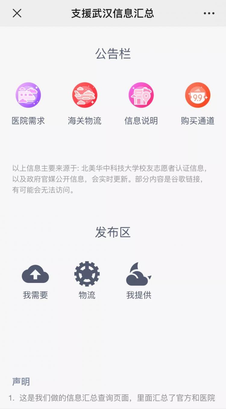 平台包含:医院需求:搜集了湖北省(武汉、黄冈、孝感、鄂州、随州、宜昌、黄石、荆门)的一百多家医院联系电话和联系人;武汉各大医院物资需求和联系方式等;海关物流:收集了境外至中国的物资运输车辆资源和一些免税通关政策;信息发布:制作了北美支援湖北操作指南和各地志愿者群联系人;购买通道:收集了北美货源信息和美国资源寻找群,同时预留“我需要”和“我提供”接口,通过平台收集转发物资信息。在1周的时间里,总共平台转发超过4500次。比起奋战在武汉*的医生、护士、解放军以及千千万万的抗疫英雄,我和几位同事做的是微不足道的,但作为一名复旦人,“勇担社会责任”就是我们的使命。阳光总在风雨后,相信疫情一定能被战胜,武汉加油!中国加油!