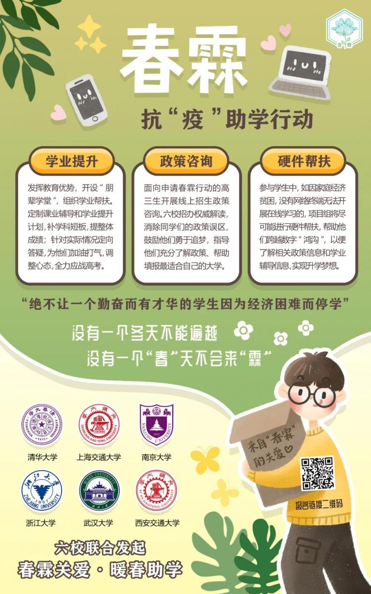 2020年是脱贫攻坚的决战决胜之年,突如其来的新冠肺炎疫情给这场硬仗带来了新的挑战。扶贫先扶智,为了帮助更多国家贫困地区专项招生计划实施区域的高三学生克服不利条件、全力冲刺高考、实现升学梦想,3月12日,清华大学、上海交通大学、南京大学、浙江大学、武汉大学、西安交通大学六校决定联合发起“春霖”抗疫助学行动(以下简称:春霖行动)。