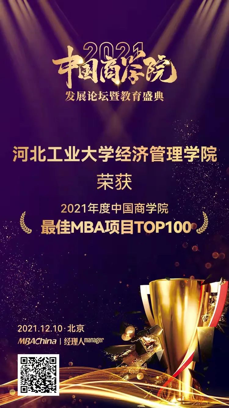河北工业大学经济管理学院MBA项目凭借其优秀的教学质量,独特的教学理念和丰硕的教学成果,荣获2021年度中国商学院最佳MBA项目TOP100第68名!